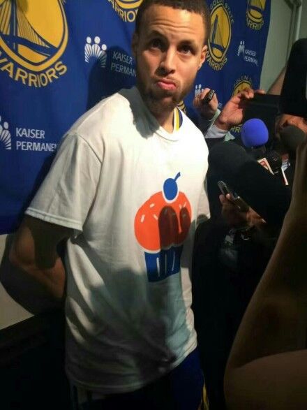 没想到这件T恤引起了一些勇士队球员的兴趣。当比赛结束之后,库里走入球员通道,我们注意到他的背上披着一件白色的“杯子蛋糕”T恤,而格林直接把这件T恤穿在了自己身上,并露出得意的笑容。