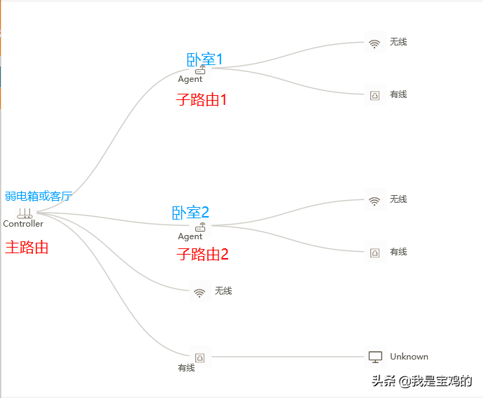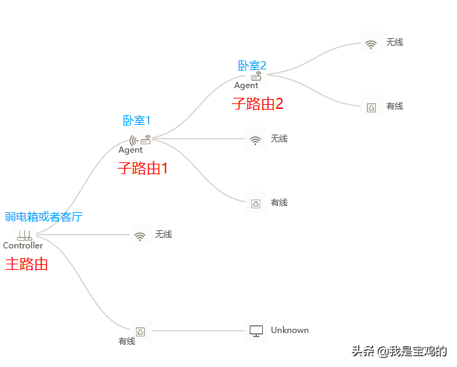 组网方式多样,如上图只需要修改主路由WIFI配置信息,其他子路由会自动同步与主路由一致;