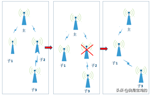 子节点2断开后,子节点3不受影响,会自动跳到主节点或子节点1,不至于影响子3下的上网设备,不会造成网络的部分瘫痪;
