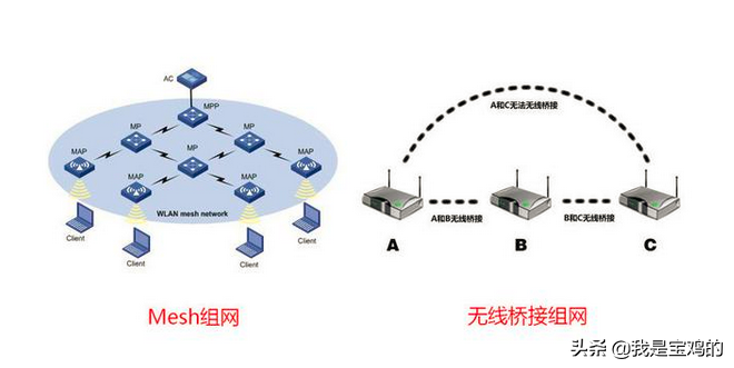 Mesh组网即”无线网格网络”,无线Mesh网络,是一种新无线局域网类型。与传统WLAN不同的是,无线Mesh网络中的AP可以采用无线连接的方式进行互连,并且AP间可以建立多跳的无线链路。图1左边是一个典型的Mesh网络的示意图。