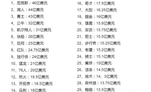 来看NBA各球队的最新球队市值排行榜市值前三